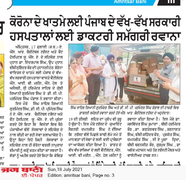 ASR’s President Dr Inder Pal Singh would like to thank Dr Jinen Thakkar of Kent Hospital for coordinating the donation, and all those providing voluntary support in the massive task of distribution, including Ms Gurpreet Talwar and Mr Praveen Kumar of Iera Living; Mr Manik Sachdeva of Seair Logistics; Mr Anoop Nautiyal of Social Development for Communities Foundation; Ms Kriti Pradhan of AIF Foundation; Mr Sahil Sehrawat, Mr Manoj & Ms Poonam of JDM Cargo Planners; Dr Mona Shah of IMAI Alliance; Ms Pooja Trikha of R Mehra & Associates; Mr Dhamanjit Singh & Dr Bhagteshwar Singh of ASR; and Mr Ravneet Singh Khurana & others at the Government of Punjab.